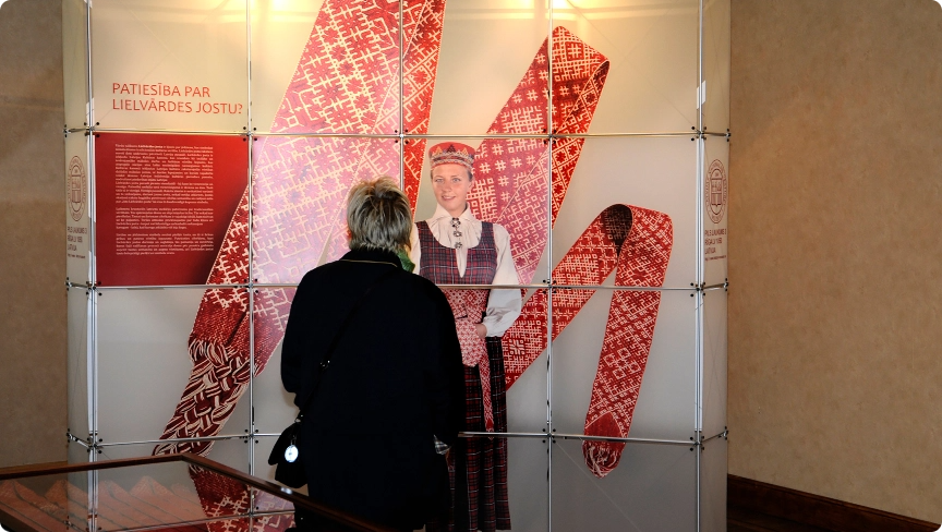 Izstādes attēlos skatāmi unikāli krājuma priekšmeti, mūsu valsts tradicionālās kultūras lepnums, kas iekļauts Latvijas kultūras kanonā – Lielvārdes jostas. Papildu informāciju sniedz skaidrojošas anotācijas un apraksti.
